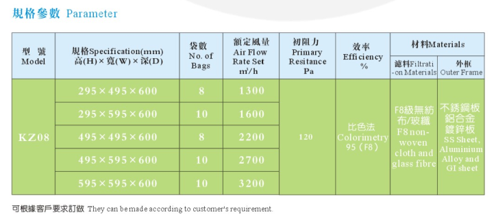 本公司采用的濾材為三層濾料均勻熱熔粘合。第一層粗纖維過濾棉捕捉空氣中較大的塵埃,較細的纖維濾紙捕捉空氣中較小的塵埃,最外層無紡布為強化保護層。合理的三層設計使產品具有優(yōu)良的性能,牢固的熱熔技術避免了風壓產生的泄露,隔網避免了袋與袋之間的貼合,更加細化了送風區(qū)域,降低了阻力,并使容塵量達到了最大。